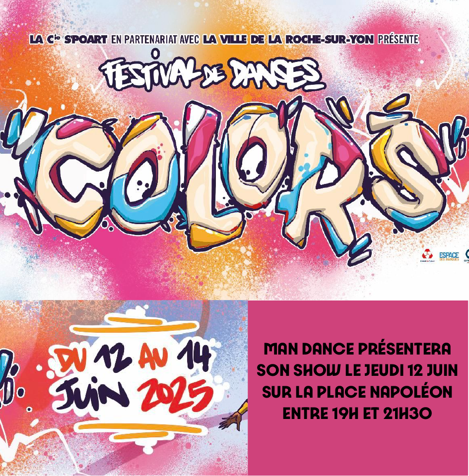 Une partie de la team MAN DANCE aura le plaisir de présenter son show lors du Festival COLORS, organisé par la Compagnie S’POART à La Roche-sur-Yon !